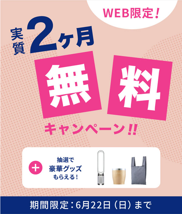 新規申込の方全員に定額料金4,400円が、3ヶ月半額の2,200円で利用でき、いつ解約しても違約金0円です。さらに、抽選100名様に豪華カタログギフトをプレゼント!