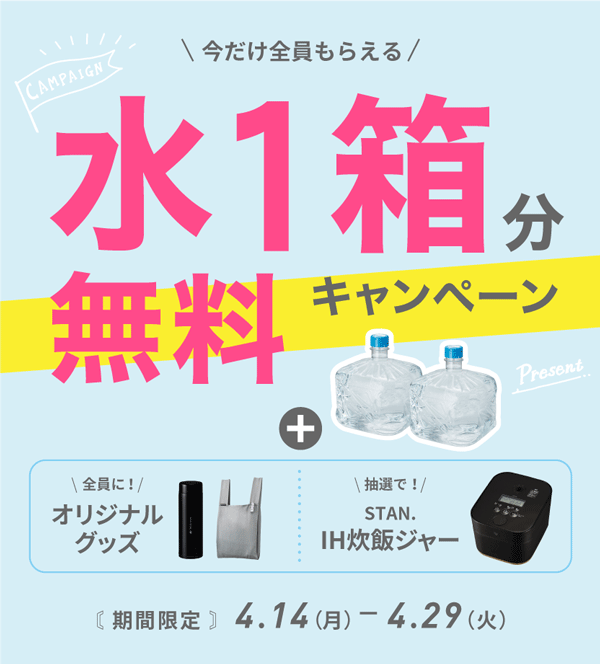 | 月額 内訳 | ■水代:4,104円 (12L×2本) ■サーバー代:無料 |