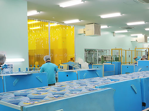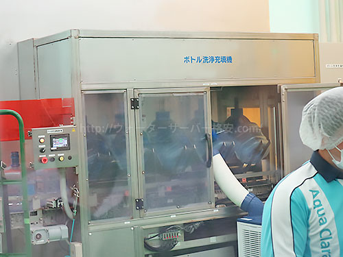 ここでできた製品水(RO水+ミネラル)が、洗浄殺菌されたボトルに充填されていきます。