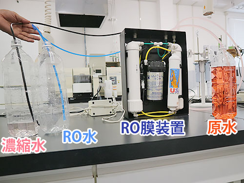 食紅で色付けされた原水が、真ん中のRO膜装置を通り、RO水と濃縮水(不純物を含む)に分かれてでてきます。