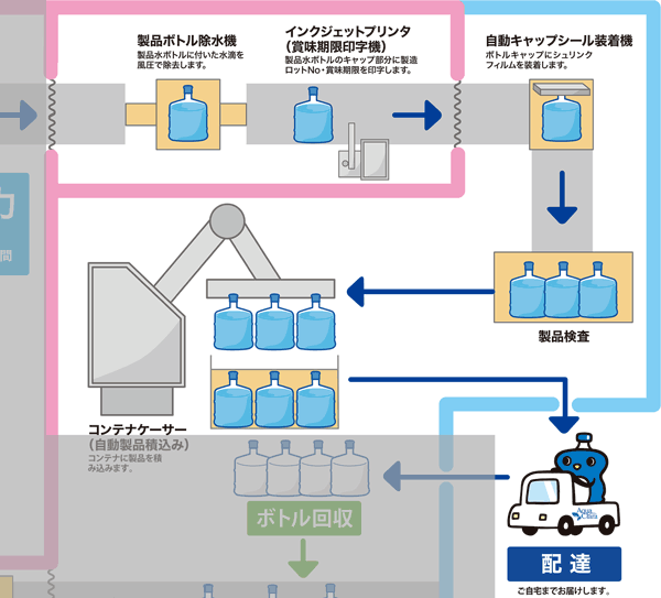 ここまでの「ボトル検品」「ボトル殺菌洗浄」「製品水の製造充填」「最終検品」といったいくつもの工程を終了し、初めてお客様宅へ配達されていくんですね!!