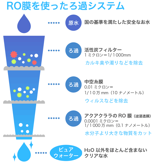 RO水は、さきほど説明した「RO膜」というろ過システムで、天然水に微量に含まれることもある汚染物質も除去可能です。