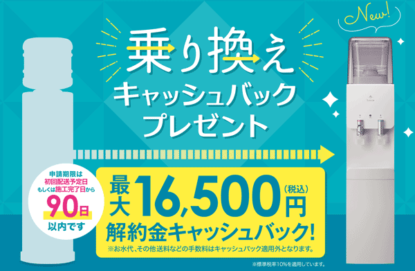 | 8ヶ月に1回/無料 (1日3.3L使用を目安) ご自身で交換 | 5年以上:無料 5年未満:10,000円 4年未満:20,000円 3年未満:30,000円 2年未満:40,000円 1年未満:50,000円 | 全国 |