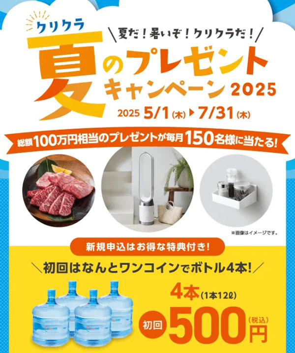 新規ご契約の全員に、初回限定で水ボトル4本が92%OFFの500円と、初月のあんしんサポートパック無料になります。さらに、抽選で8名様に三菱電機コードレススティッククリーナーをプレゼント!