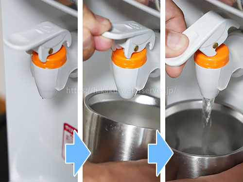 出水レバーを上げ、奥に押し込みます。(写真:中央)