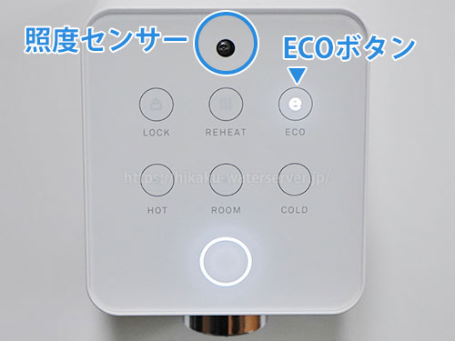- 温水温度を58~63℃(通常80~85℃)、冷水温度を14~20℃(通常5~10℃)に弱め、消費電力を抑える省エネ機能。また、部屋の明るさを感知し、部屋が暗くなると自動で消費電力を抑える。