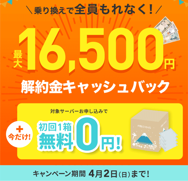 | 解約金 | 1年未満:16,500円 1年~2年未満:9,900円 2年以上:無料 ※サーバー交換した場合、交換日より計算 |