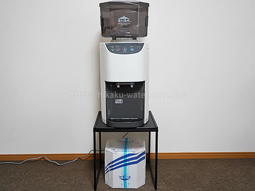 富士の湧水ウォーターサーバー床置きタイプ(ニューホワイト)の設置写真、置台の下に水のダンボールが置ける