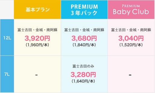 ※プレミアムウォーターには、PREMIUM3年パック限定で富士吉田の7Lボトルがありますが、cadoサーバーでは使用できません。