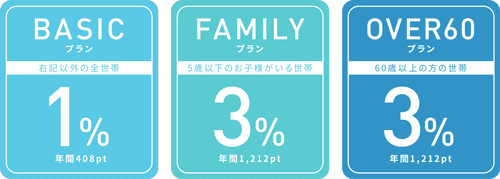 | FAMILYプラン (妊婦又は5歳以下のお子様がいるご家庭) | 4% (年間1,608pt) | 3% (年間1,212pt) |