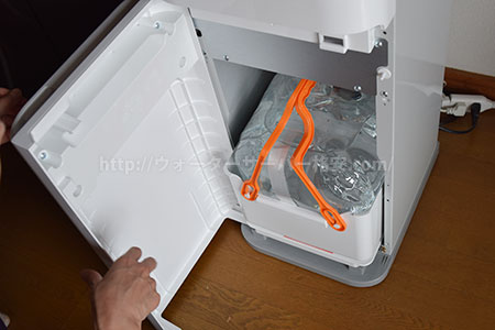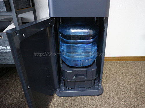 コスモウォーターのボトル下置きサーバー「スマートプラス」は本体下部の扉を開けると、ボトルを入れるバスケットがあり、それにボトルを設置するだけです。